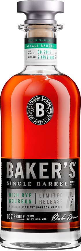 "Baker's High-Rye Bourbon is crafted from a bourbon mash bill with more rye grain than the traditional Baker's recipe, highlighting how the distinct grain blend influences each barrel's individuality. This liquid is distilled to a 107 proof and barreled and aged for a minimum of 7 years, allowing the bourbon to pull more caramel, dried fruit, and vanilla flavor from the barrel wood." Distiller's Notes