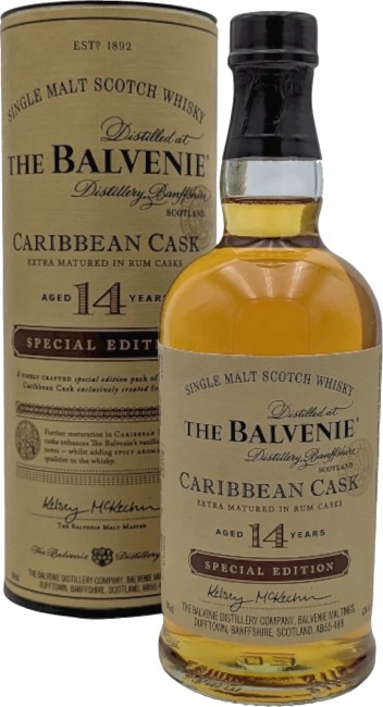 "Caribbean Cask has been matured in traditional oak whisky casks for 14 years, and then ?finished' in casks that previously held Caribbean rum. The result is an exceptional single malt whisky with the traditional smooth, honeyed character of The Balvenie, married with notes of toffee and a hint of fruit, with a warm, lingering finish." Tasting Notes