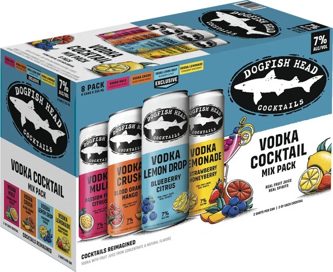 "A variety pack containing two cans each of Dogfish Head Blueberry Citrus Vodka Lemon Drop, Passionfruit Citrus Vodka Mule, Blood Orange and Mango Vodka Crush and Strawberry and Honeyberry Vodka Lemonade."