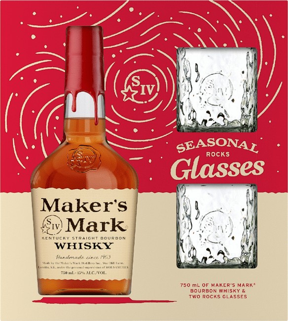 Gift set includes one 750ml bottle of Maker's Mark and two rocks glasses. "Sublimely sweet, ambrosial bouquet that features vanilla, chocolate fudge, buttermilk and hazelnut. On the palate it is impeccably balanced; rich, mature flavors of tobacco leaves, caramel, red fruit and pine combine elegantly on the tongue. Aftertaste offers dark caramel and sweet pipe smoke." 95 Points, Wine Enthusiast "Best Buy"