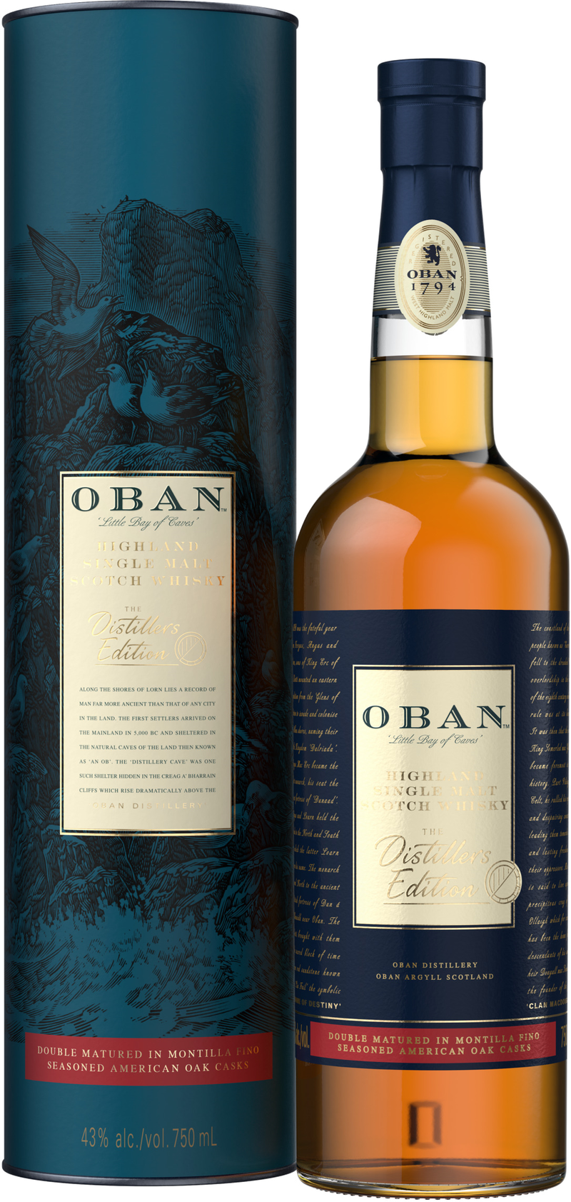 "To underline its sea-laced flavors, the Master Distiller of Oban has chosen Montilla Fino. This dry, delicate cask beautifully enhances the distinctively graceful style of Oban. The smooth Oban brings creamy smooth appeal from casks elegantly wine-seasoned with a light fino from Montilla, to expand the fruity and salty Oban style." Producer Notes